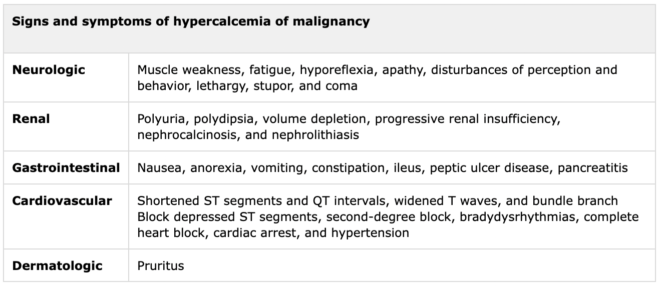Patients with severe hypercalcemia are almost universally symptomatic. Common clinical manifestations of hypercalcemia from malignancy are summarised below: