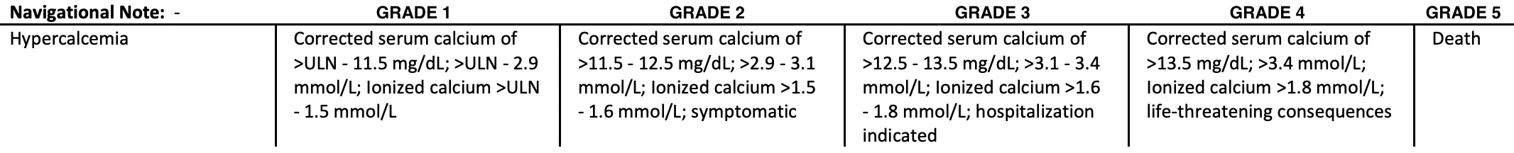 According to the Common Terminology Criteria for Adverse Events (CTCAE) v.5.0, hypercalcemia is defined as follows: